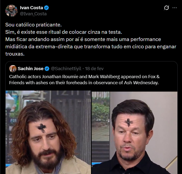 Transformar isso em "performance de extrema-direita" revela menos sobre quem recebe as cinzas e mais sobre quem já não consegue enxergar religião fora da gramática da política. Tudo se transforma e se reduz a palanque porque a própria cabecinha oca já se organizou como palanque.